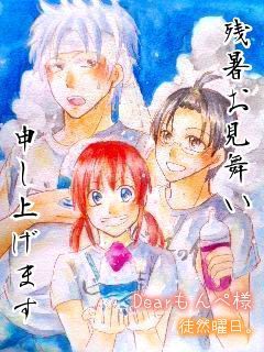 「徒然曜日」の空野様からいただきましたv サイトにUPする為に空野様宅から画像をいただいてきましたが、実はこの直筆イラストをいただいてしまったのですよーv とても綺麗で優しい色彩の水彩画で心が洗われます。 坂田家合作の苺氷はしっかりといただきましたーvv しっかり者の新八君がシロップ量をきちんと管理してるそうですよ(笑) 空野様、どうもありがとうございましたv 20100905 もんぺ